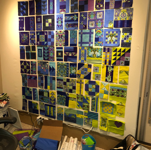 So laying them out has been a multi-week challenge as I sort, then re-sort ad nauseum, trying to find the “perfect” layout. I am thankful for my new design wall which has given me the space I need to see them all at once and keep them in place as my brain percolates the various arrangements. I also find that taking pictures is very helpful. There is something about seeing the design in two dimensions instead of three that gives me clarity.